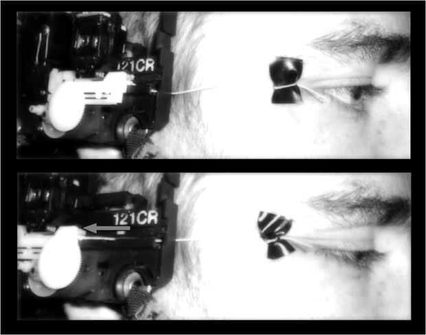 Aquí le damos fotos y un video de las pruebas originales de todo el sistema. Estoy controlar el movimiento del actuador linear tocando mi alambre pulgar mi anillo o dedo índice (o ninguno). Trabajó muy bien y fue capaz de tirar de la piel con suficiente fuerza como para causar la distancia viendo el efecto que mencioné en la introducción. Aún así, tomó retoques para conseguir el mecanismo que coloca a la altura correcta en mi cabeza para tirar de la piel en el ángulo derecho para provocar el efecto. Cualquier versión comercial futura de este sistema se beneficiaría de tal vez tres actuadores lineales separados, cada uno coloca en un ángulo ligeramente diferente que permiten personalizar la tensión necesaria para su fisiología específica.