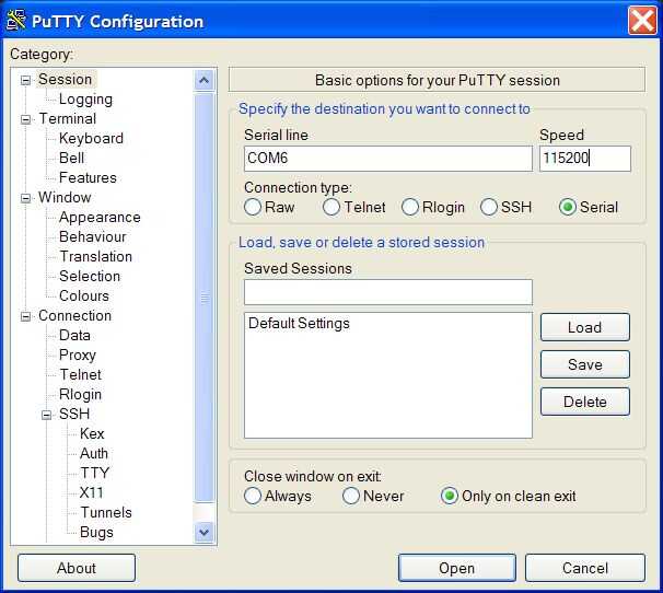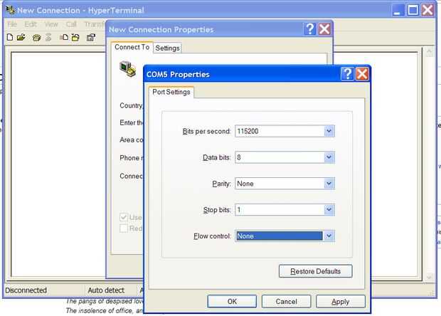 Si estás en Windows Vista, HyperTerminal no está incluido. En este caso, ir descargar PuTTY (Windows installer). Utilice los ajustes de conexión a continuación para configurar la masilla, usando el puerto COM adecuado.