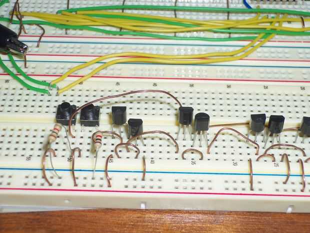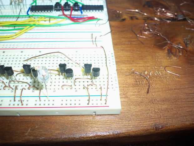 Cableado encima de los botones es bastante recta hacia adelante. Uno de los pines obtiene atado a + 5v y el otro está ligado a la tierra a través de un resistor. La salida del botón es el pin que está ligado a la tierra.  La salida de botón escriba habilitar conectada a las puertas de habilitar.  La salida del botón de línea de Bit está conectada a la entrada del primer inversor.  La salida va a activarla y a puerta el segundo Inversor.  Su salida va a la otra permiten.  No voy en detalle en la construcción de los inversores, porque ya había cubierto.