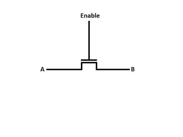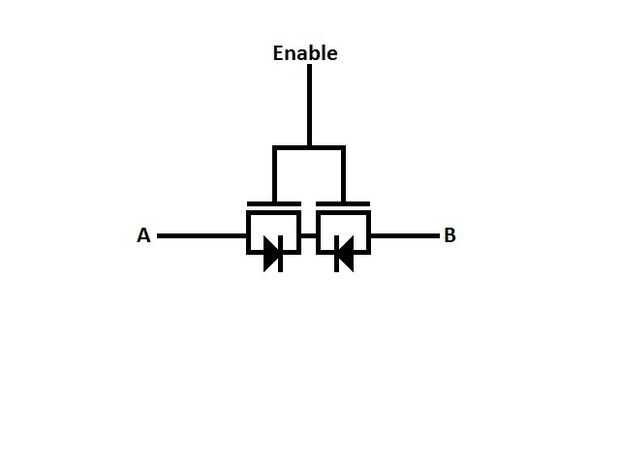 Para contrarrestar esto, ponemos 2 FETs junto con sus diodos hacia direcciones opuestas. Así, corriente no puede fluir en cualquier dirección libremente a menos que el MOSFET se enciende. Por esta razón nuestro SRAM tendrá 8 transistores en lugar de 6.