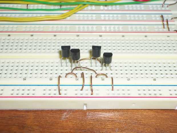 Ahora vamos a conectar a los inversores. La salida de uno se conecta a la entrada del otro. Para ello, conecte un cable al pin 2 de un transistor en el inversor de la izquierda y conecte a la salida del otro transistor. La salida del inversor es que el pin 3 del BS250 y pin 1 del 2N7000 se conectan juntos. Repetirlo, pero con la entrada del inversor adecuado y la salida de la izquierda.