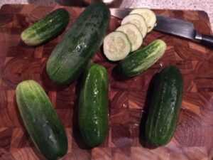 Lave y rebane pepinos en ruedas de 1/2 pulgadas. Cebolla rebanada en finas promociona. Remoje pepinos y cebollas blancas en agua helada por 1 hourDrain de pepino y cebolla en el colador y añadir a media potCombine stock todos los ingredientes restantes y llevar a fuego lento durante 5 minutos. Mientras que los pepinos son hervir a fuego lento.
