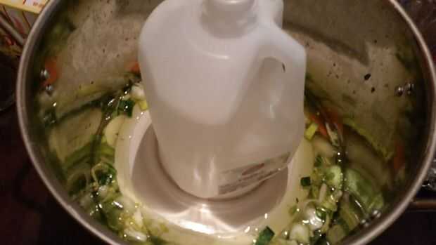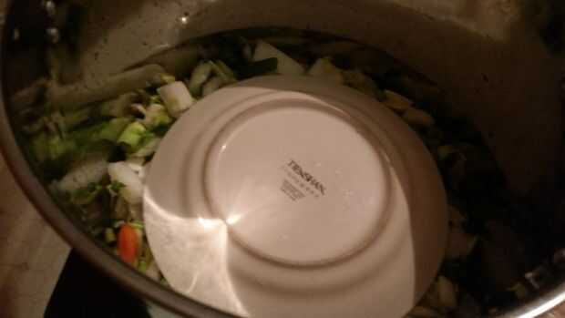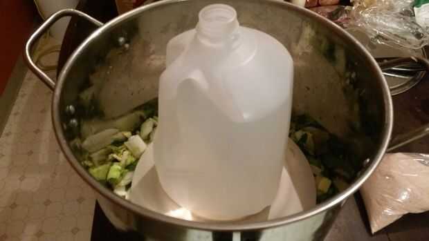 Con todas tus verduras en un recipiente no reactivo Espolvoree sal 1Tbs (cualquier sal como no hay ningún yodo) por 2 tazas (nonclorinated) de agua sobre tus verduras. No añadir sal a muchos alimentos así que mi plataforma no lo necesita para sabor. Añadir debido a necesidad de fermentación segura. Recomiendo que si utilizas a menudo sal considerar duplicar el contenido de sal. Es más fácil y mejor agregar extra ahora que intentar más tarde. Usar menos sal hará fermentar más rápido así que medios deteriorables si hay demasiado poco. Espolvorear uno CDA y luego uso 2 tazas de agua para "lavarla", agitar con la mano desde la parte inferior y llevar a la cima. Hacer esto hasta que la salmuera es aproximadamente la mitad de la profundidad de las verduras. Comprimir y cubrir las verduras con una placa, poner algo de peso sobre ella para empujar en la salmuera (yo uso una jarra de galón de agua). Como la sal tira el agua de las verduras se colocan más y finalmente sumerja completamente. Dejar así durante 6-8 horas para dejar que esto suceda.