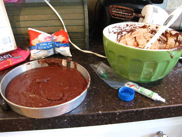 Bastante sencillo. Hornear su pastel según las instrucciones en la caja, o su propia receta. Asegúrese de que ponerlo en una cacerola de círculo! Es la parte más importante.