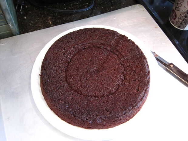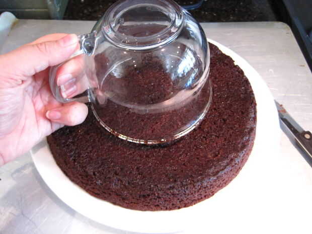 Ahora toma el recipiente o redondo lo y ponerlo en el centro de la torta. Presione suavemente en el pastel, por lo que tiene un pequeño anillo con sangría.