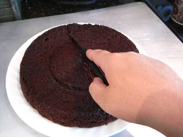 Asegúrese de que cortar a través de todo el camino. No intente levantar la torta ahora, porque podría desmoronarse.