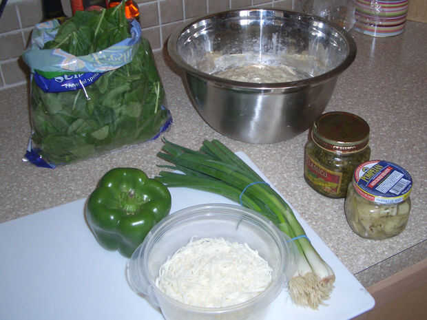 Paso 1, montar los ingredientes. Masa, queso feta y mozzarella queso, pimiento verde, pesto de albahaca, 1chicken mama, corazones de alcachofas, espinacas y cebollas verdes.