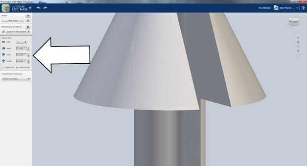 El siguiente en la lista es tamaño del objeto donde instalaremos cuán grande será el modelo. El dimensionamiento debe coincidir con lo que usted hizo en TinkerCAD, forma la abertura central que medimos será del mismo tamaño en la impresión. Aquí es donde especifique el grosor del material que vaya a utilizar. Usé 1/2" madera para mi lámpara.