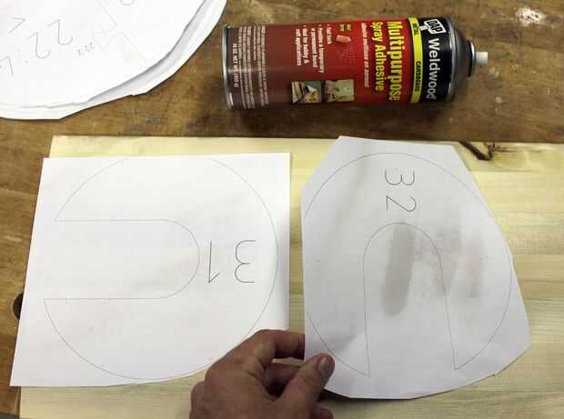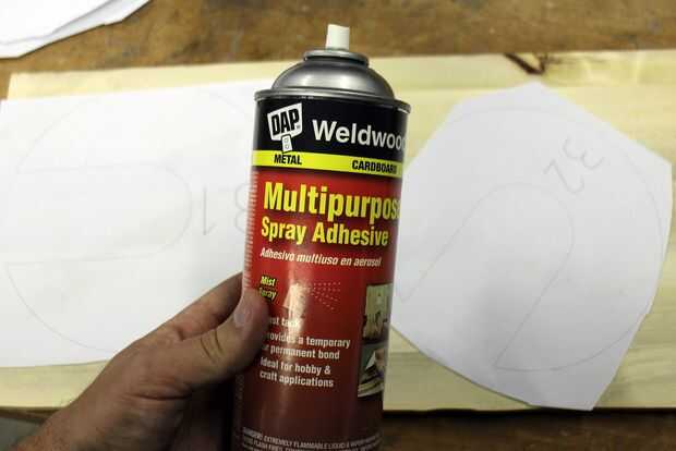 He utilizado un adhesivo en aerosol para las plantillas de papel se pegan a mi tablero de madera de 1/2". Para la una rebanada tuve que imprime no enteramente solía un lápiz para marcar en la madera el resto de la forma.