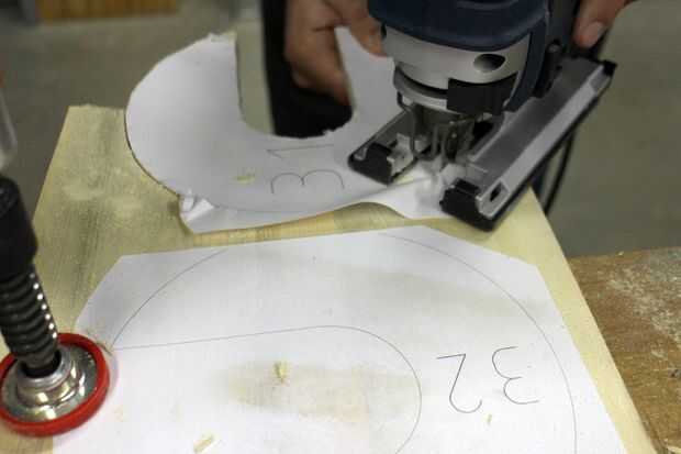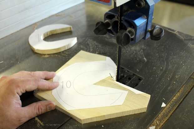 Usando un rompecabezas o sierra de cinta, corte con cuidado las formas hacia fuera. Si tienes 2" pedacito de taladro puede perforar el centro de cada pieza antes de limpiar los costados con una cuchilla.