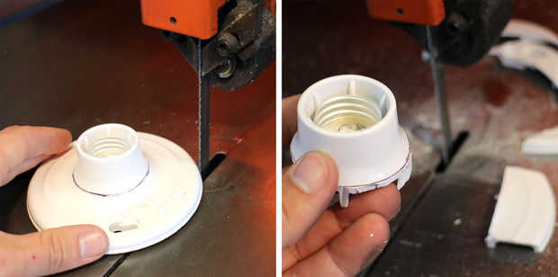 Utilizando una sierra de cinta cuidadosamente corte la brida de plástico alrededor de la toma de luz, siguiendo la línea que trazó. Asegúrese de usar una varilla de empuje para mover la pieza alrededor de la hoja y no recibe los dedos demasiado cerca!