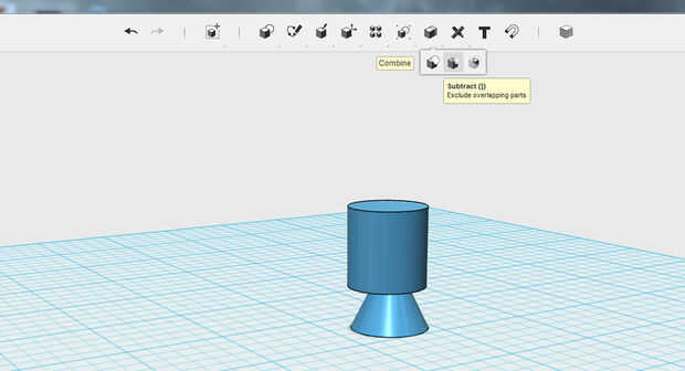 Haga clic en el cilindro, en cualquier lugar de la escena para quitar la selección de la botella. En la barra de elemento superior haga clic en el icono combinar , luego la resta en el submenú. En primer lugar, haga clic en el cono el cilindro, haga clic en, luego presione la tecla enter para confirmar la selección, esto reste las dos formas y los dejo con un cono truncado.