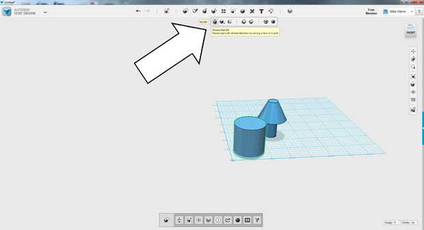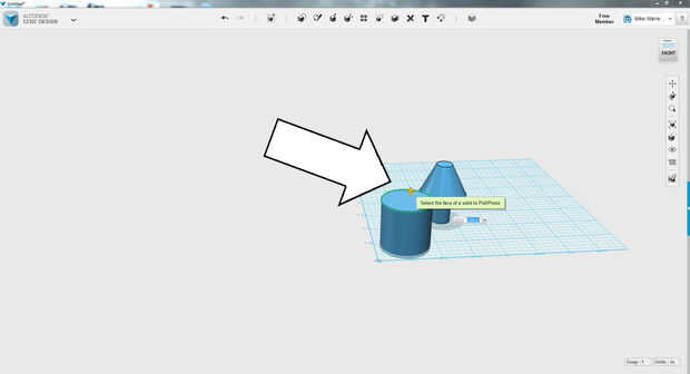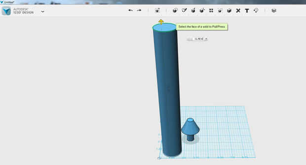 En la barra de acción superior haga clic en el botón modificar , luego Tire de prensa desde el submenú. Haga clic en la parte superior del cilindro de referencia nuevo y tirar hacia arriba, mientras tira se mostrará la medición de la altura del cilindro. Seguir tirando el cilindro hacia arriba hasta que tenga la altura que es mayor que la altura final de la lámpara. En mi caso, ya que mi lámpara iba a ser 12" de alta hice el cilindro 16" de alto.
