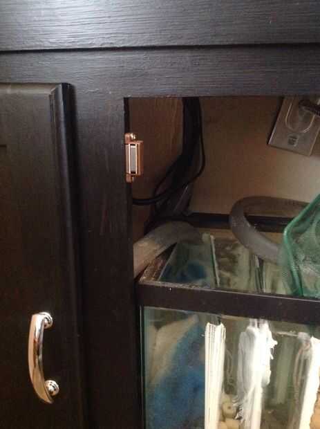 Utilizamos imanes de gabinete en la parte superior para fijarlo. Se encaja a presión encendido y apagado como esperábamos.