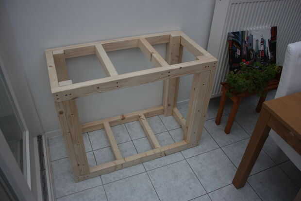 Añadir dos pedazos más cortos a cada esquina. Estas piezas deben ser un ajuste apretado y deben ser martilladas en su lugar. Añadir algunos tornillos para fijar permanentemente estos soportes.