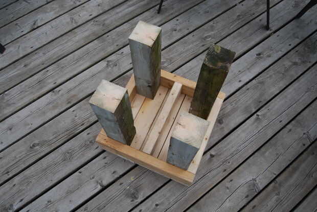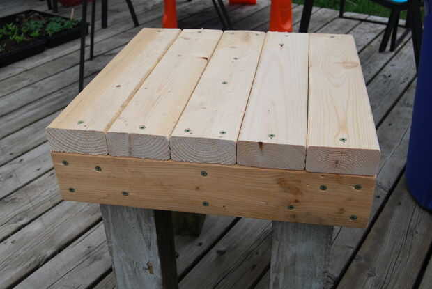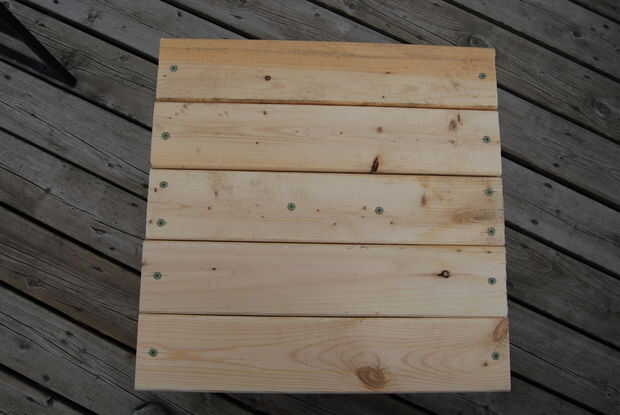 Comencé por montar los lados, puso hacia fuera los lados largos y había colocado entre los más cortos, sujeción en su lugar condujo dos tornillos por esquina desde el lado largo al corto les ajustar hasta justo debajo de la superficie de la madera. A continuación añadí el travesaño con un par de tornillos en cada extremo. Después que me di cuenta que había introducido en la dirección equivocada y debería haber ido a través del centro de los cinco mejores tablas, no debería afectar fuerza global sin embargo así que lo dejé como está más que han dejado agujeros feos.