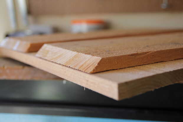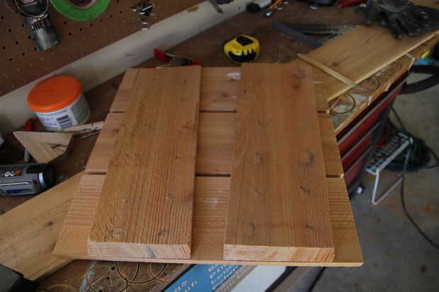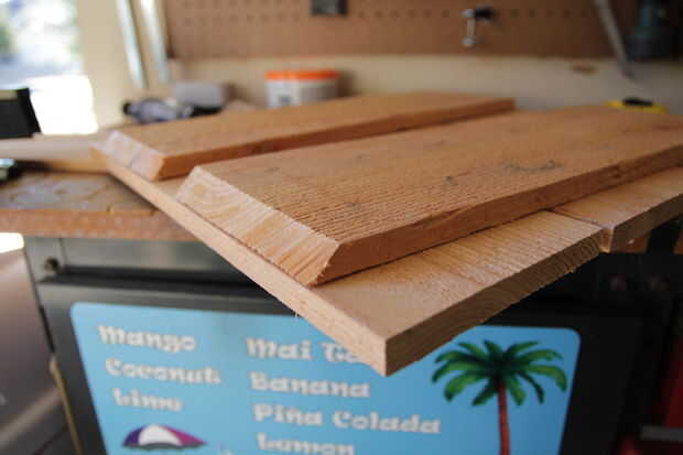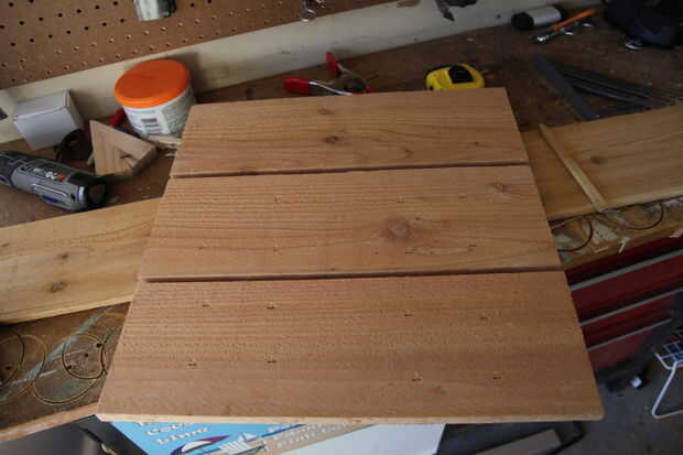 hice el estante sí mismo fuera de 3 cortes de 18" de longitud de la duela de cedro cerca, apoyado por dos cortes de 18 1/2" con un ángulo de 45 ° sobre la superficie delantera para una mirada más limpia. Utilice su pistola de clavos o tornillos para llevarlo todo junto. Hay un espacio de 1/4" entre cada tablón (ancho de lápiz de carpintero estándar).