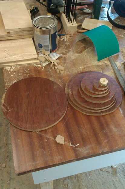 ahora su madera y dibuja un círculo de 1". Ahora dibuja otra 0.5" más grande. Hice 9, pero puede hacerlo tan alto como quieras. (me gustaría ver la altura puede ser) ahora corte el polo algunos segmentos de 3" y 5". y cortar un cuadrado más grande que el círculo más grande.