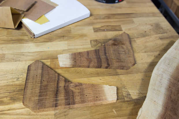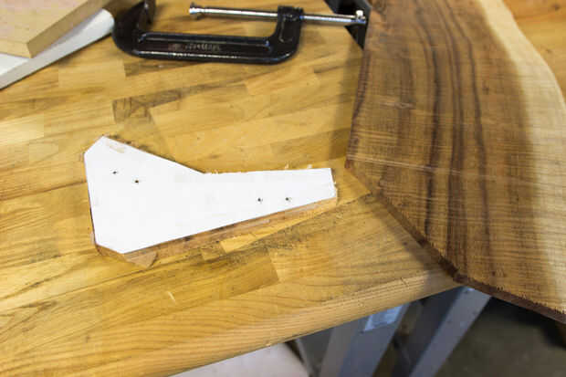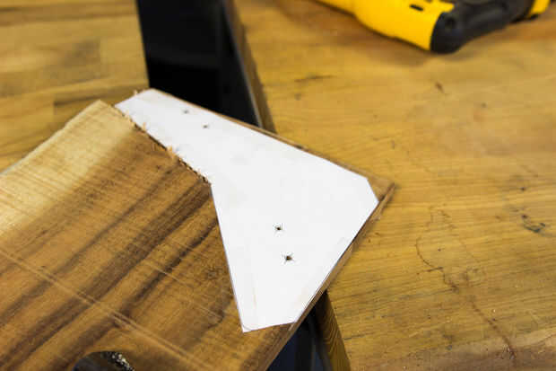 Imprimir otra plantilla de la zona y cortar el conjunto de dos agujeros y cinta en el lado de la madera. En cuanto a mí, las mediciones y algunos pelos de cruz por donde taladrar los orificios. Utilice una broca de 1/8 de estos agujeros