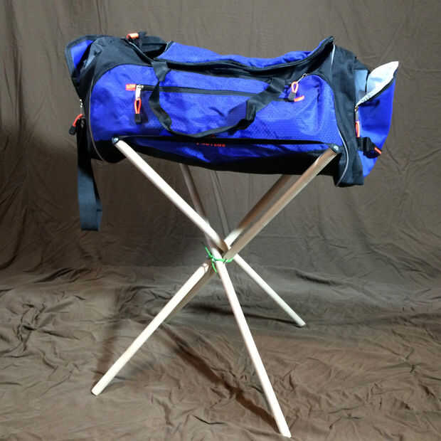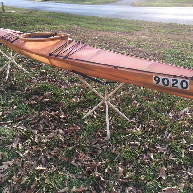 Esto es lo que se me ocurrió. Soporte de su base de kayak portátil Suspenz. 24" de alto por 17" de ancho cuando está en uso. doblado es hasta 36" de largo.