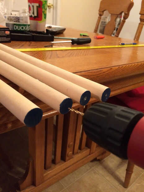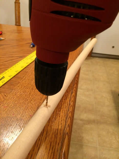 uso 3/32" pedacito de taladro y taladrar el punto marcado en el centro de la anchura de las clavijas de madera. No perfore a través de todo el camino. 1/2 camino debería ser suficiente.