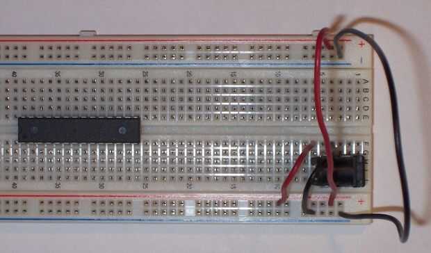 Ahora que queremos poner el microcontrolador en su protoboard como se muestra en la foto. Si se trata de un nuevo chip, tienes que doblar dos filas de pines de un poco más. Qué hacer, es mantener el chip de ambos lados y presione un poco el chip contra una superficie plana como un escritorio y hacerlo en ambos lados para que ambos lados están doblados en equailly.