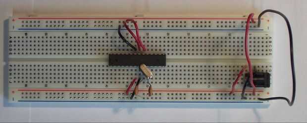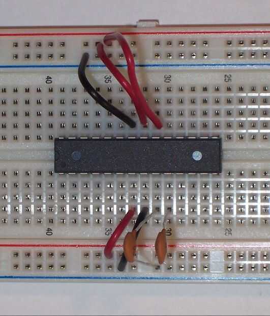 Ahora para el cristal. Coloque una pierna del cristal en el pin 9 y la otra pierna en el pin 10... pero asegúrese de colocarlo entre los condensadores y el chip/microcontrolador. Vea las fotos.