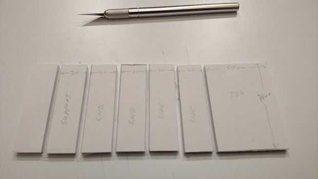 Localice la placa de base de espuma (170 mm x 70 mm) y marque una línea en 50mm desde el extremo. Este rectángulo se convertirá en la parte superior de la base del trofeo.