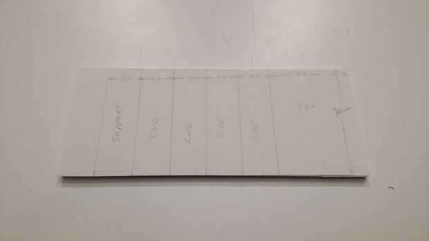 Continuar midiendo desde la línea que a creado y marque 5 línea más cada 20mm de la anterior. Yo he marcado la imagen para mostrar el propósito de cada sección.