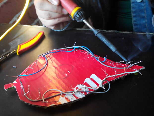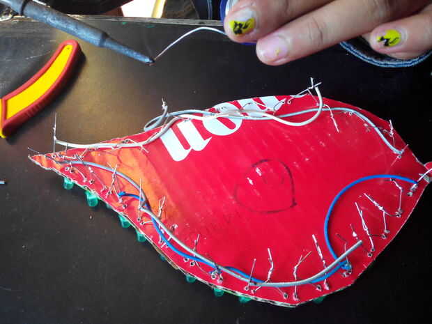 Después de torcer las patas de los LEDs conectan el positivo con withnegative positiva y negativa con los cables. Prueba con la batería y ver si funciona, si lo hace entonces lo (Ten cuidado) usando alambre de soldadura, soldador, soldadura
