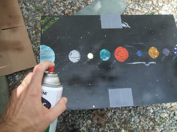 Cuando estés seguro de que has escrito correctamente todos los planetas (gritos), y no desea añadir los gráficos más frescos en la escena, entonces agarra tu laca spray y agitar durante un minuto. Huele muy fuertemente, por lo que recomienda el uso de un respirador y asegúrese de que está fuera. Rociarlo con golpes incluso, ida y vuelta. Que quedarse fuera como 25 minutos a que puede secar sin tocarla.
