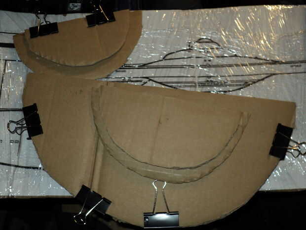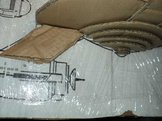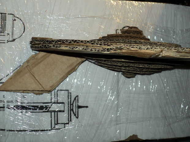 I cortar cartón y overlaid en el dibujo. Tenga en cuenta que sólo estamos haciendo un medio o el costado de estribor de la nave. Puede hacer un modelo entero y cortar por la mitad para dos estantes.