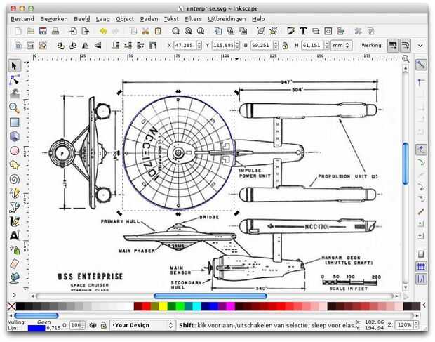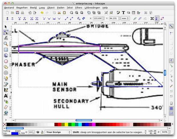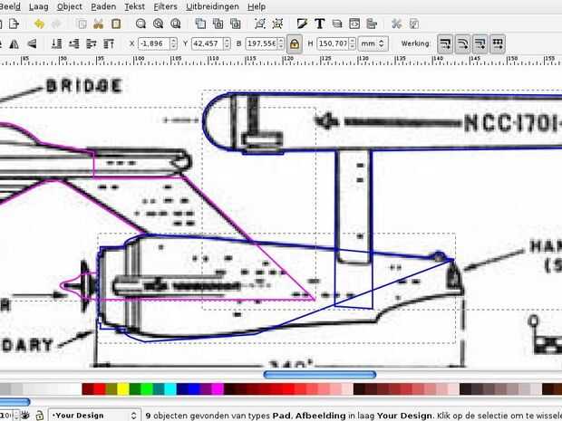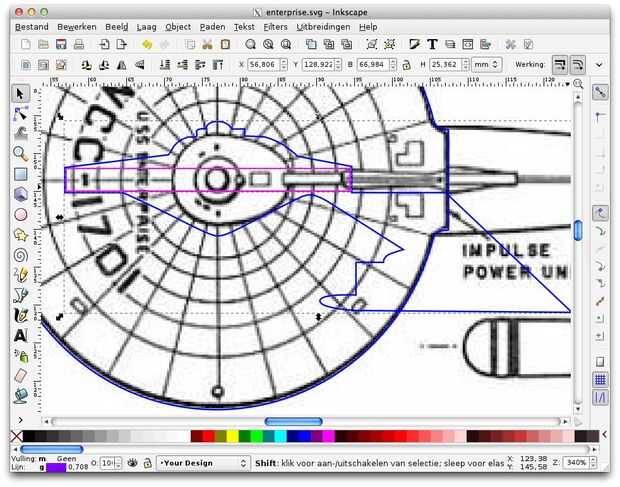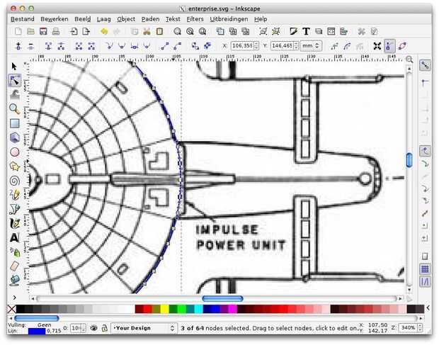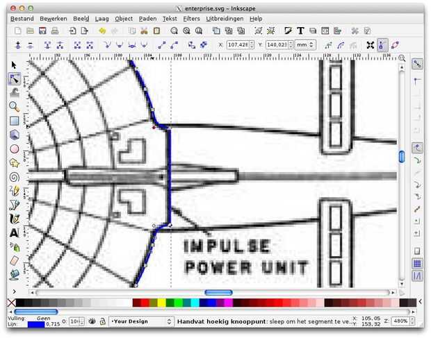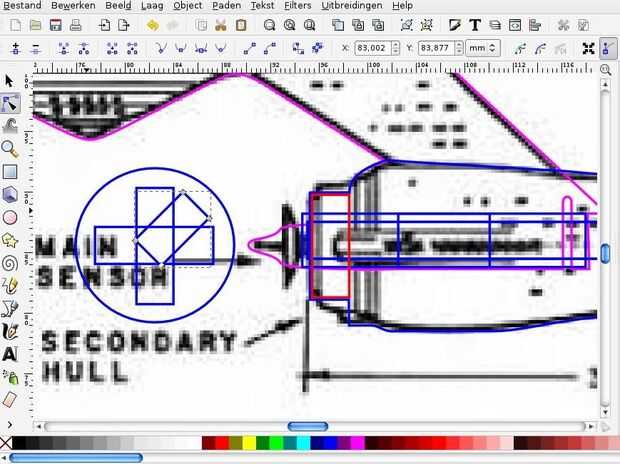 Comencé a dibujar sobre los contornos para hacer las partes principales. Traté de mantener el modelo simple, con una cuenta de la parte baja. Primero seguí al tamaño de que la imagen sucedió a entrar, pero más tarde los escalar un poco por lo que el modelo resultante es a escala 1/2000 (unos 15cm de largo) el platillo (casco principal en el cuadro de Vista ortográfica), el puntal principal y las barquillas (unidad de propulsión) con struts son partes evidentes. El truco era integrar el casco secundario como tres partes que se unen. Mantener estas piezas en ángulo recto era una misión que primero reservé para el plato deflector (sensor principal en la imagen), pero que no mira a la derecha por lo se convirtió en un anillo detrás del plato deflector.