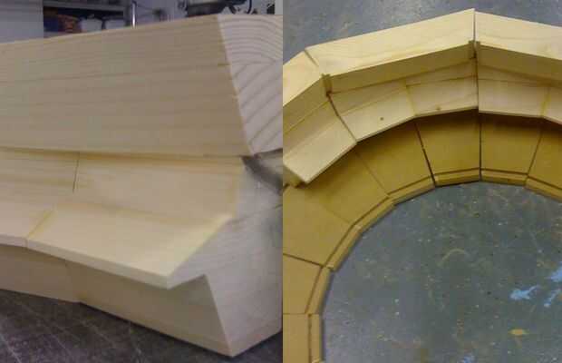 Usando las piezas de la planta como guías para los ángulos de corte y apilado las formas para hacer que el perimetral de la consola. Esto resultó para ser muy difícil porque las consolas superiores echada hacia delante. Me pareció la manera más fácil de conseguir todo en la alineación unir las tres capas y recorte el ángulo final en la Sierra de mesa. En la parte inferior de cada sección os adjunto fichas de registro en las ranuras del piso.