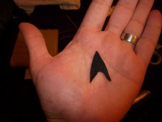 Necesidad de un disfraz de Star Trek, miró a su alrededor y descubrió que la más fácil de hacer serían la de Voyager (junto con las estaciones más últimas de DS9). Para ello me vieron numerosas imágenes y decidió hacer de las 2 camisetas (el negro ti