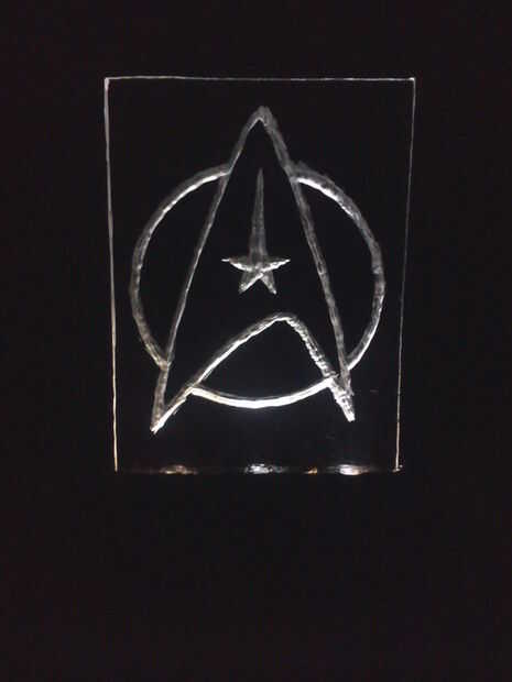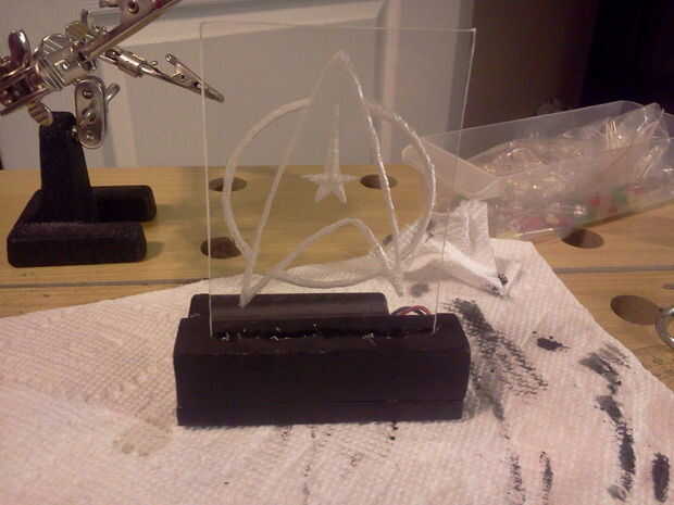 Todo llevó era una pieza de acrílico grabado con una dremel, un pedazo de madera como base y 3 LEDs.