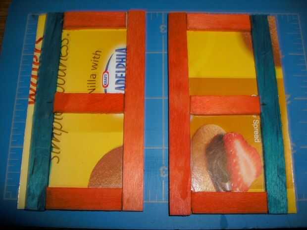 6. pegamento 1 de las piezas de palo corto craft 90 * al palo largo y al ras del borde de cartón perpendicular. Repetir en el borde opuesto y en el otro trozo de cartón (ver figura 2).