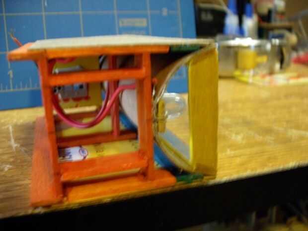 12. Aplique pegamento en los extremos y el centro de una cara de un "poste" luego insertarlo entre los paneles superior e inferior con el lado de la cara de pegamento cuentas hacia la parte posterior del reflector en uno de los 3 puntos "la pared", alinear en la misma orientación que el corta pega en el panel superior e inferior y presiónelo contra la parte posterior del reflector para asegurarse que sea 90 * hacia arriba y abajo (ver Figura 7). Repita este proceso para las ubicaciones de remianing 2 "pared" contra el reflector.