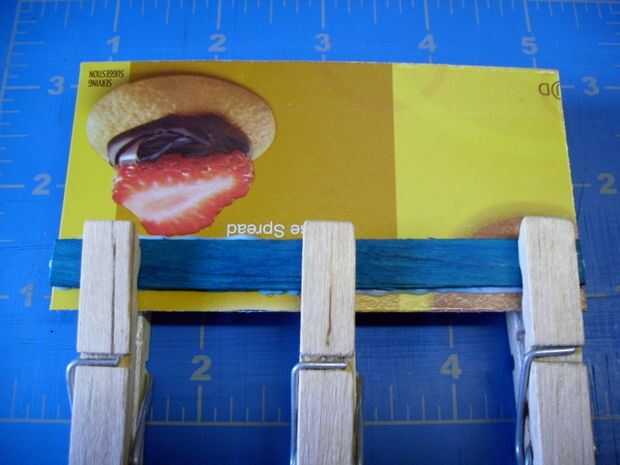 5. Alinee el borde de uno de los 4 largos trozos de palillo de arte en esta línea (ver figura 1) y pegar la cara del palo a la cartulina asegurándose de que los extremos queden al ras con los bordes perpendiculares de la cartulina. Use las pinzas o abrazaderas para sostener el palillo en su lugar hasta que el adhesivo se seque. Repetir este proceso en la otra pieza.