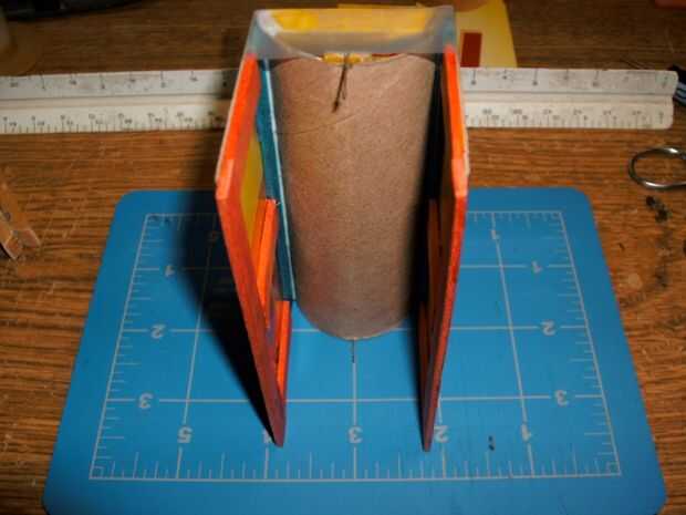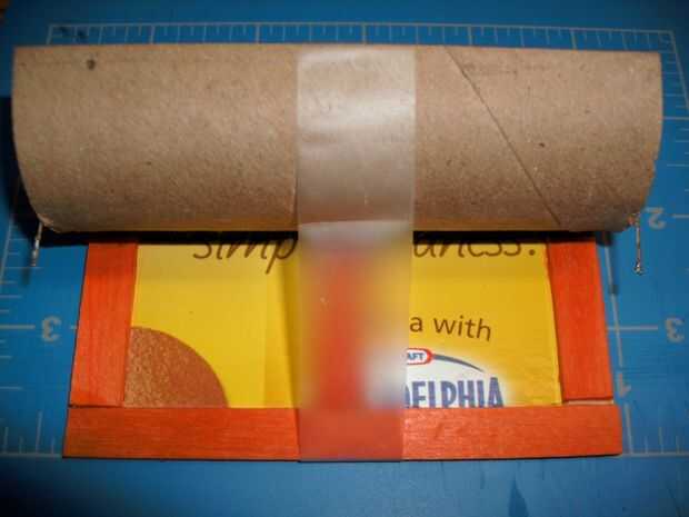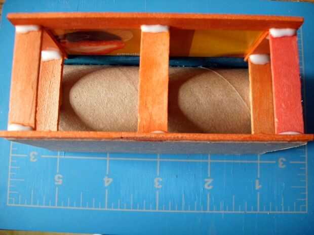 11. reste el espesor de un palillo de arte x2 del diámetro exterior del tubo de papel higiénico y use esta dimensión para cortar 6 pedazos del palillo de arte. Estas piezas serán los "postes" entre los paneles superior e inferior (ver figura 6).