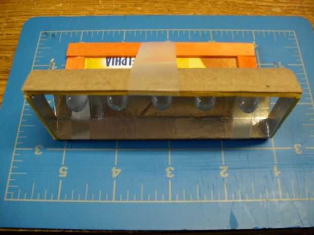 10. con el lado de arte palillo de un panel de frente en pegamento el borde largo de 3/16 cartón expuesto a una borde largo del reflector y temporalmente fije con pedazos de scotch cinta (ver figura 5). Repita con el otro panel.