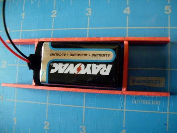 6. corte cuatro longitudes de 3/4 de goma y pegamento 2 a lo largo del interior cara de dos palos largos en el compartimento de la batería al ras con el borde superior (ver figura 4).