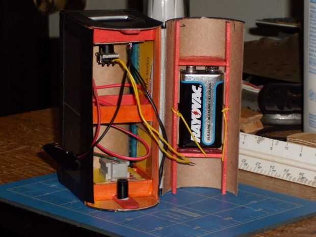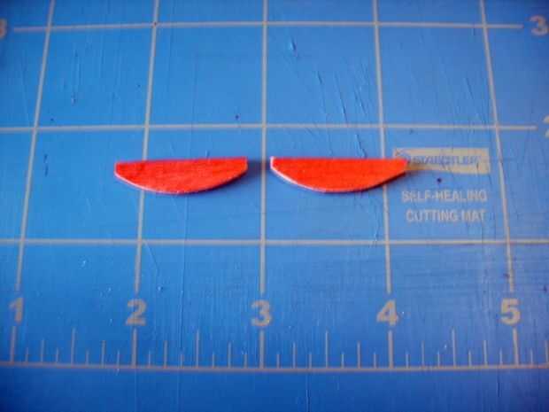 8. cortar 2 arte palo al tamaño entre los 2 palos largos, escriba el radio de la tapa a lo largo de un borde de ambas piezas. Darles forma (ver figura 6) con el utilidad cuchillo y arena papel para caber entre los bordes de los sticks de compartimiento de batería corto y la contraportada y luego pegarlos en.