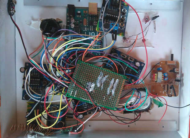 En cuanto al walkie-talkie, (que obtuve por desarmar algunos viejos nerf los) tomó de la primavera en un pulsador y empujado hacia adentro para que se quedaría allí (como se ve en la última foto), este botón le ha permitido hablar con lo otros walkie mientras usted mantiene pulsada. Pero esto significa que usted sólo puede hablar a ella y no la espalda a usted, pero esto está muy bien en mi caso. Funciona con los 9v que se activan cuando un transistor NPN (yo usé el C549B) fue basado por el pin digital de Arduino 8 (llamado waltal en el código), pero todavía tienes que pulsar el interruptor del empuje blanco para la luz se enciende y el walkie-talkie para activar, como en el espectáculo; el transistor es para abrir la ventana para activarlo después de todo lo que ha sonado.