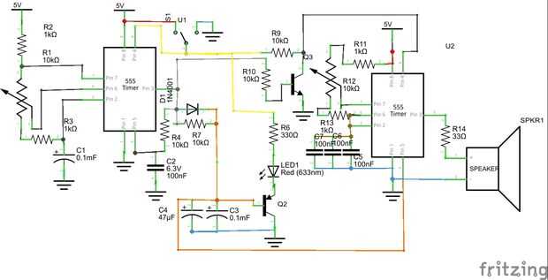 Entonces cuando la salida de los 555 va alta carga los condensadores a través del diodo, que descarga lentamente a través del resistor de 10KΩ (etiquetado R7) crean el tono cambiante que oyes.