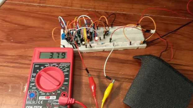 Ahora use su voltímetro para medir el voltaje en la base del transistor PNP, como el LED parpadea le debería ser capaces de ver el cambio en el voltaje.