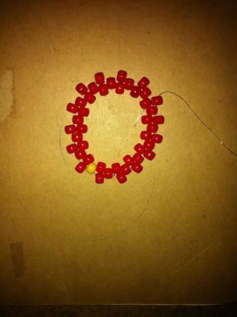 Poner un grano rojo en el extremo largo de la cadena. La cadena a través de, no el grano justo al lado del donde sale la cadena, pero el uno al lado del hilo de rosca. Agregar en otra Perla rojo y seguir tejiendo cuentas rojas a través de cada grano de otros. Debería verse como la imagen. Ate con un nudo.
