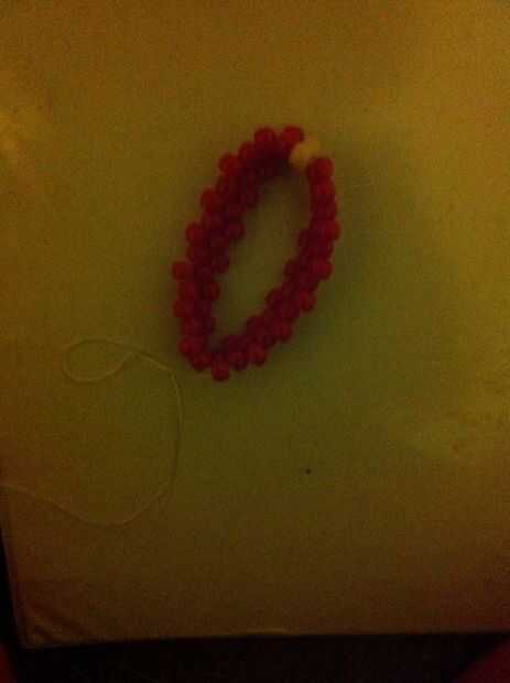 Esta fila debería ser más fácil, ya que todo lo que tienen que hacer es rellenar. Utilizar granos rojos alrededor, tejiendo a través de las cuentas que ahora resucitan. Al llegar al grano amarillo, poner otro amarillo uno sobre él. Ate con un nudo.