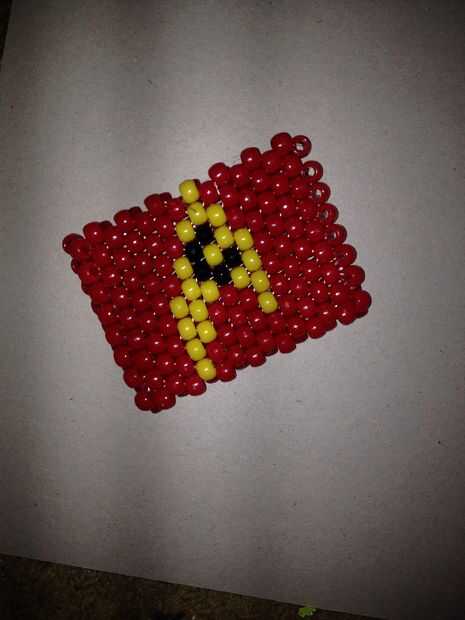 Fila 16: Uno amarillo sobre el de la fila 14. Rojo. Ate cada fila. Utilice varios nudos en la última fila y la cadena extra.