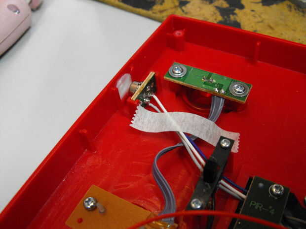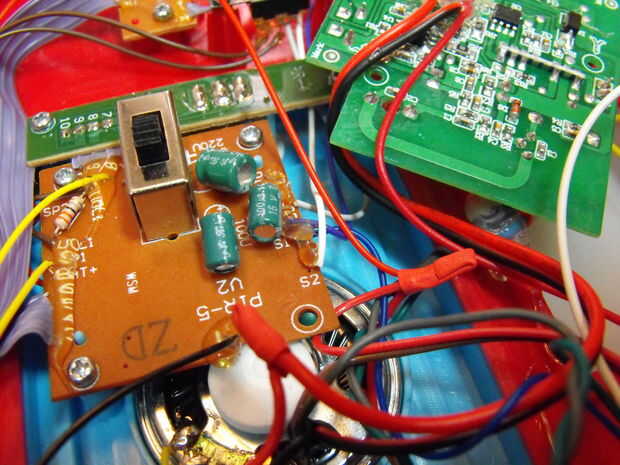 La campana Star Trek era más fácil de averiguar, sobre todo porque el circuito era más simple, pero también porque reconocí los sensores que utiliza para detectar movimiento. A cada lado de la campana hay dos sensores de infrarrojos pasivos (PIR) que apuntan hacia afuera. Estos sensores detectan luz infrarroja y son capaces de ver el infrarrojo generado calor corporal.